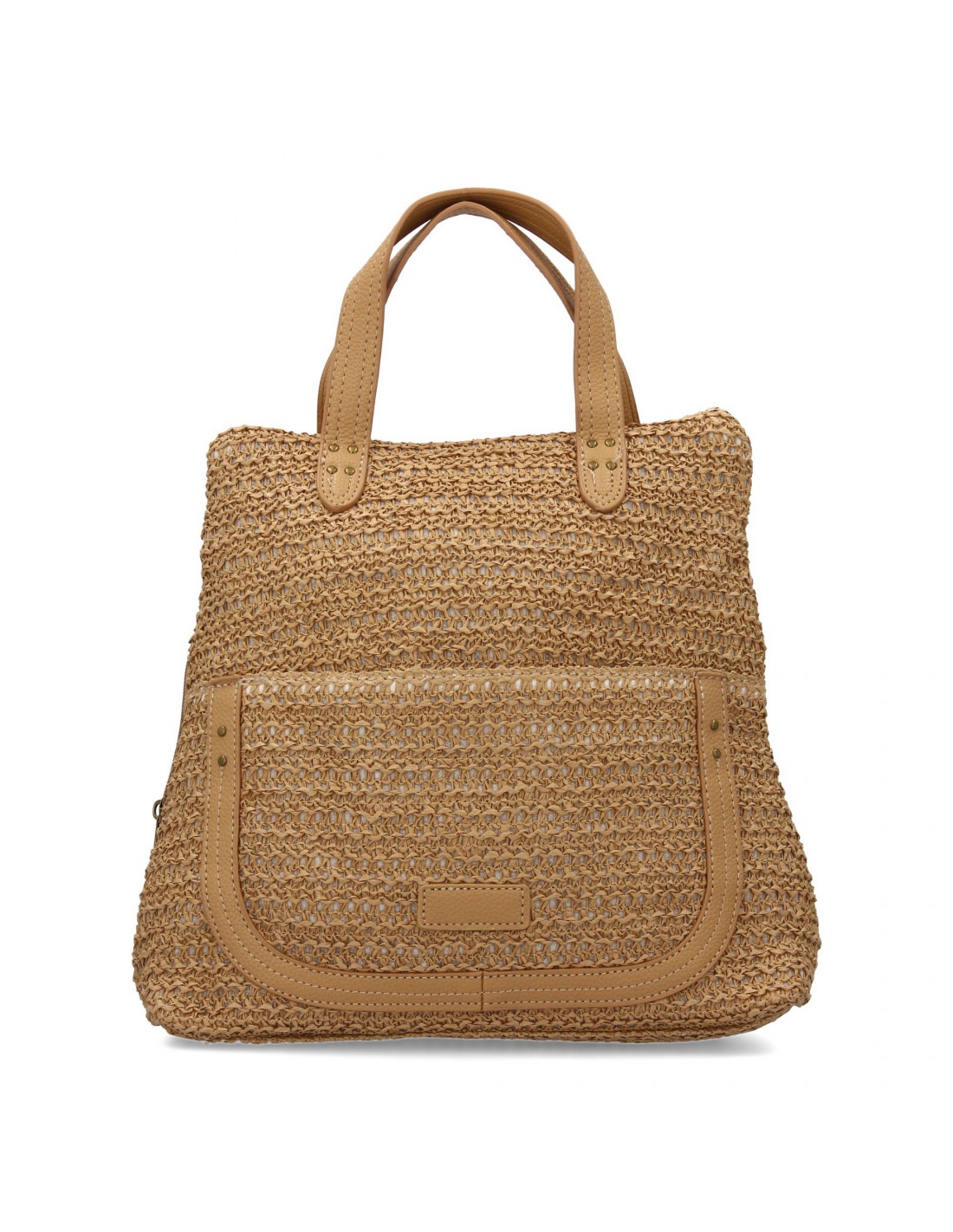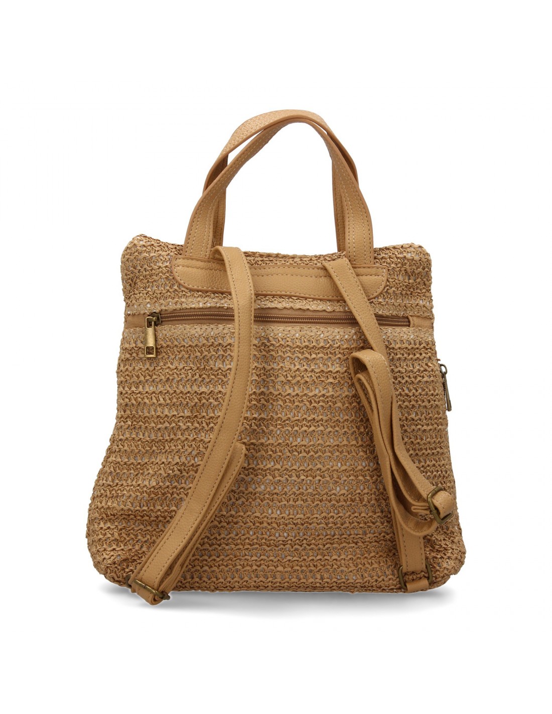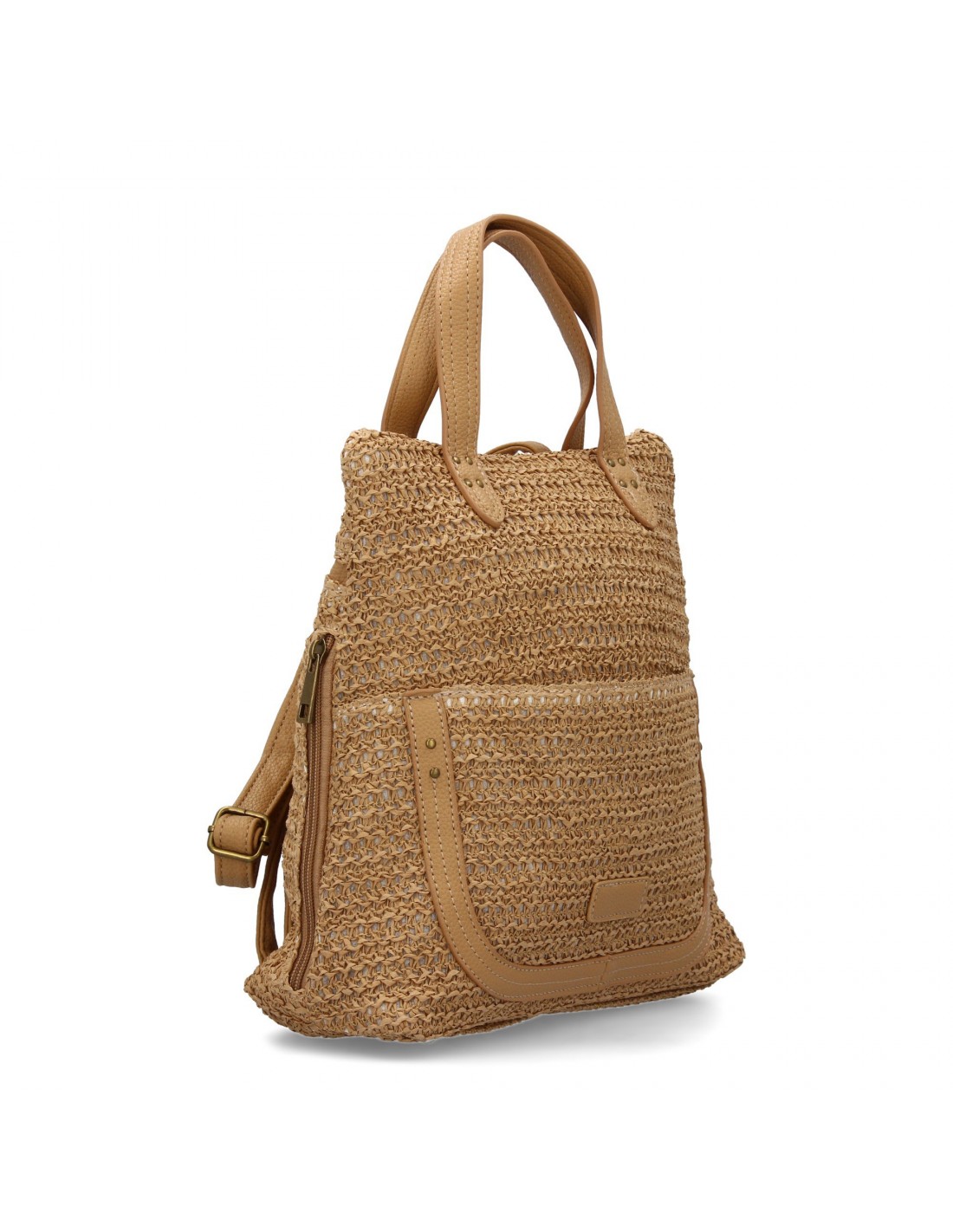 Mochila de rafia para mujer, compartimento principal de cremallera y bolsillo con botón de imán.