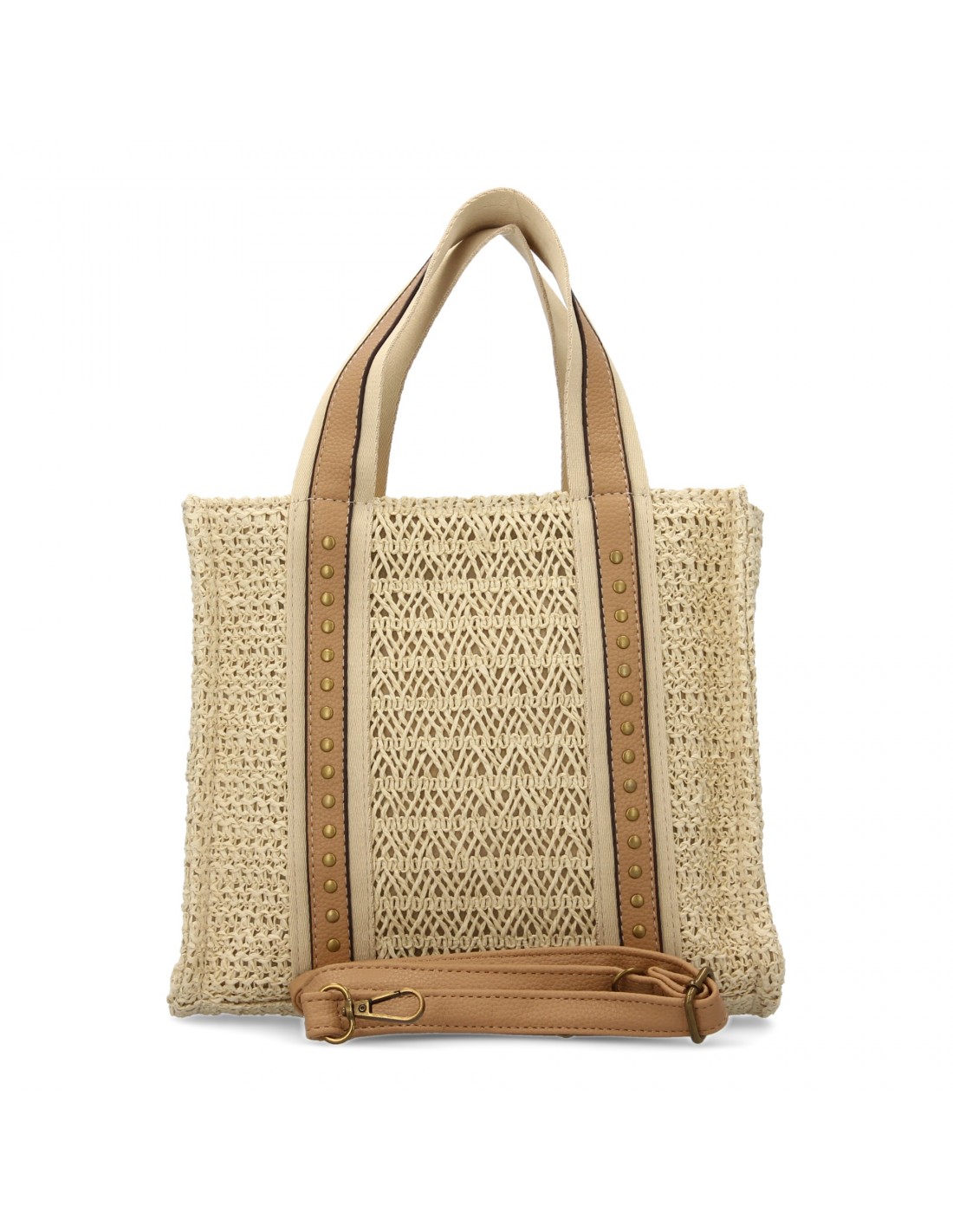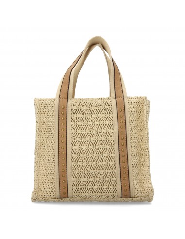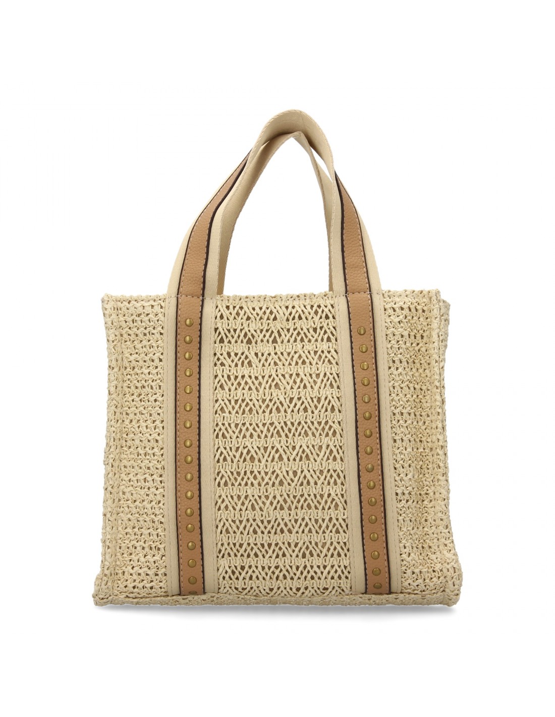 Bolso de hombro para mujer de rafia, diseño moderno con adornos metálicos.